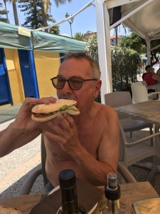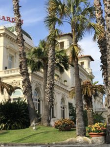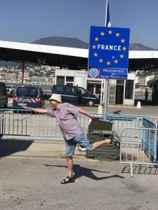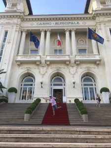 Drei Kilometer vor der Ortsgrenze stoppt die Polizia den Verkehr: Portofino ist voll! Zu viele Touristen! Ja, mit dem Bus könnten wir in den Ort fahren – aber dazu müsste man einen Parkplatz finden… Ich bin etwas traurig. Um mich aufzuheitern, bietet der Urlaubspaul spontan eine Verlängerung an: Yippie! Wir bleiben drei Nächte in Sanremo! Gut, Sanremo ist auch nicht mehr das, was es mal war. Man ahnt nur noch, wie die Reichen und Adligen um 1900 – unter ihnen Kaiserin Sissi und der deutsche Kaiser Friedrich III. – an der Promenade spazierten und in den prachtvollen Villen residierten. 1905 wurde das berühmte Spielkasino gebaut. Wir werfen einen Blick ins Kasino, fotografieren dürfen wir nicht. Und wir genießen noch einige Stunden am Strand, um vom Mittelmeer Abschied zu nehmen. Nun sind es noch 20 Kilometer bis zur französischen Grenze. Die schaffen wir auch noch!
