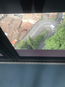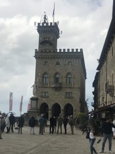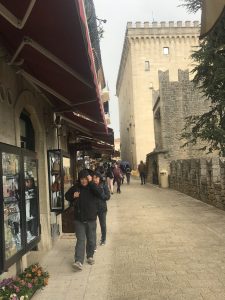 Nun verlassen wir Italien und fahren nach San Marino, eine der ältesten Republiken der Welt. Ganz schön kurvig bis nach oben, mir wird schlecht auf dem Beifahrersitz. Ich finde, Paul könnte etwas rücksichtsvoller fahren, er findet, er fährt rücksichtsvoll, die Kurven seien schließlich da. Das letzte Stück in die historische Altstadt auf dem Monte Titano legt man glücklicherweise mit einer schnurgerade fahrenden Seilbahn zurück. San Marino ist echt schön, aber der Nieselregen treibt uns dann doch schnell runter ans Meer.