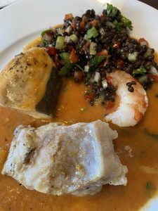 Im zweiten Gang wurde es dann feiner: Schwertfisch, Steinbeißer und ein Shrimp an buntem Linsengemüse in einer Roux, eine gut gewürzte Sauce auf Mehlschwitzbasis. In der kreolischen Küche werden Fisch und feine Saucen oft gegessen, sind in den Rezepten doch viele Einflüsse französischer Einwanderer.