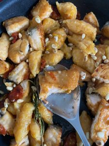 Dann haben wir alles zusammen in der Lachspfanne gemischt und mit gerösteten Pinienkernen serviert.