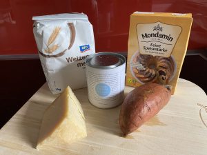 An einem Sonntag stellte sich die Frage, was machen wir denn nun mit dem gestern gekauften frischen Lachs. An Pauls Tomatenstrauch hingen noch viele schöne Cherrytomaten, bei den Kartoffeln lungerten noch zwei Süsskartoffeln rum und seit Ewigkeiten wollten wir doch Gnocchi mal selber machen! Also los:
