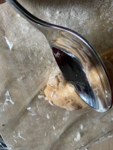 Mit langsamen Bewegungen (sonst klebt der Teig so) haben wir die Menge vermischt. In Rollen in Frischhaltefolie verpackt und in den Kühlschrank gelegt. Dort liegt auch noch immer eine Rolle, die am heutigen Montagabend ihrer Bestimmung zugeführt wird.