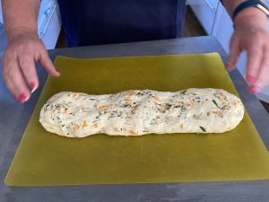 In den schon einmal gegangen Teig alles einkneten und noch mal gehen lassen.