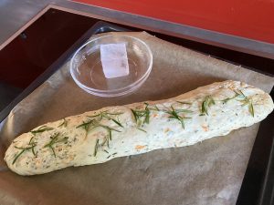 Wir haben dann noch eine halbe Möhre geraspelt und ganz viel Rosmarin mit dem Wiegemesser klein, aber nicht zu klein – wie sagt man? geschnitten, gewogen? Na ja, jedenfalls Möhren und Rosmarin dann noch mit dem Teig gut vermengt und noch mal 30 Minuten im Backofen gehen gelassen. Dann 35-40 Minuten bei 185 Grad gebacken und kurz vor Ende noch mal mit Eigelb bestrichen.